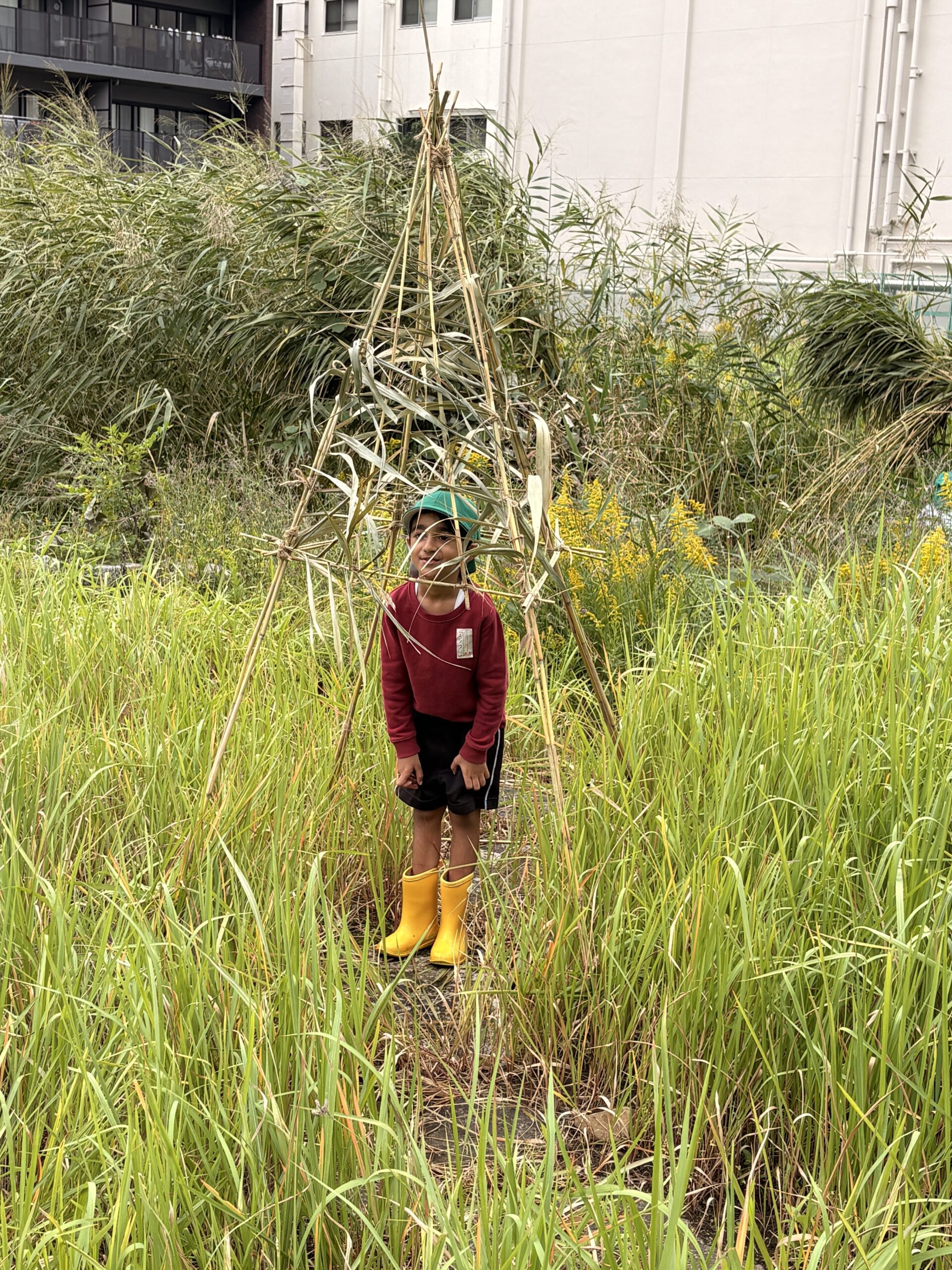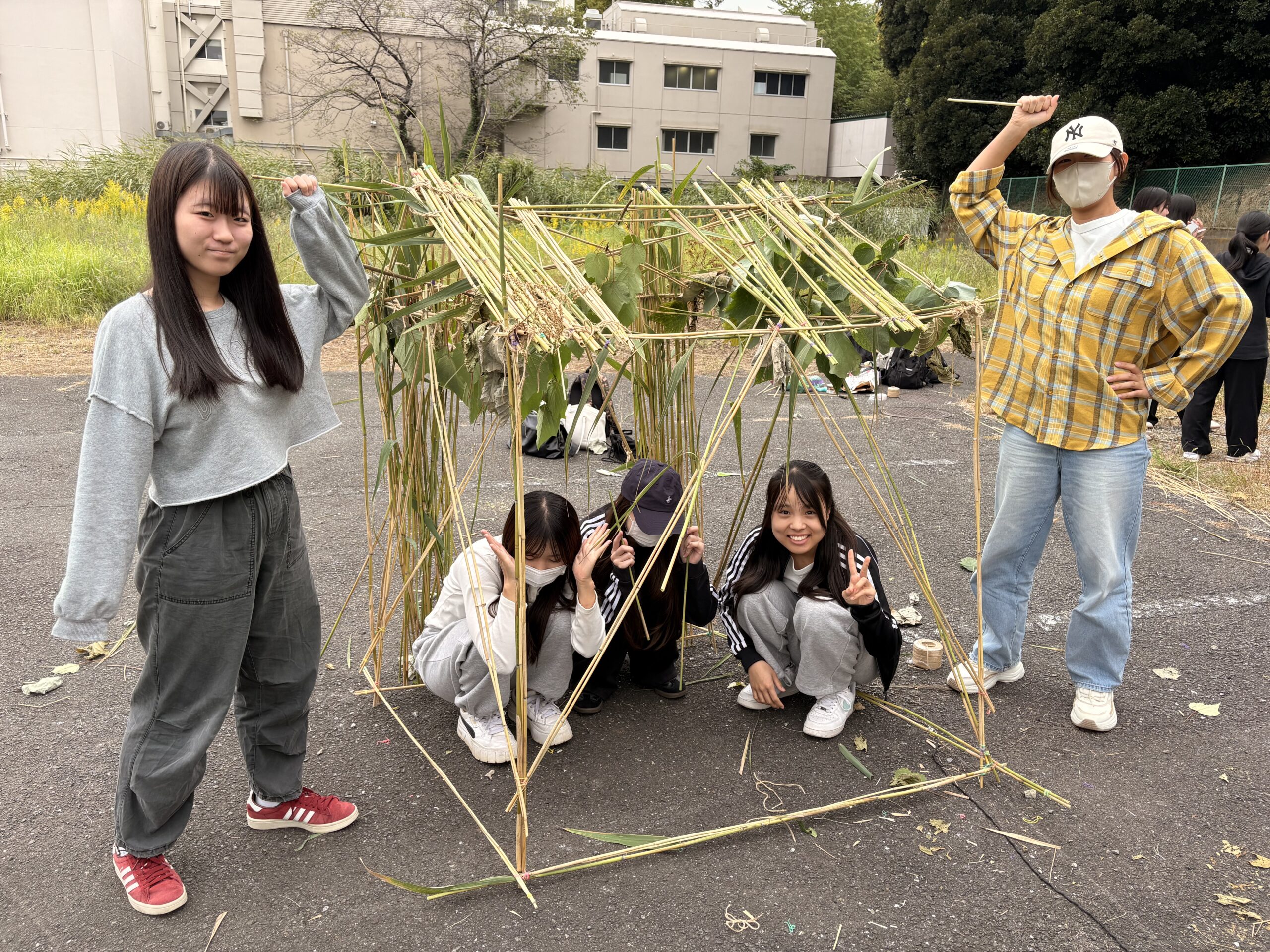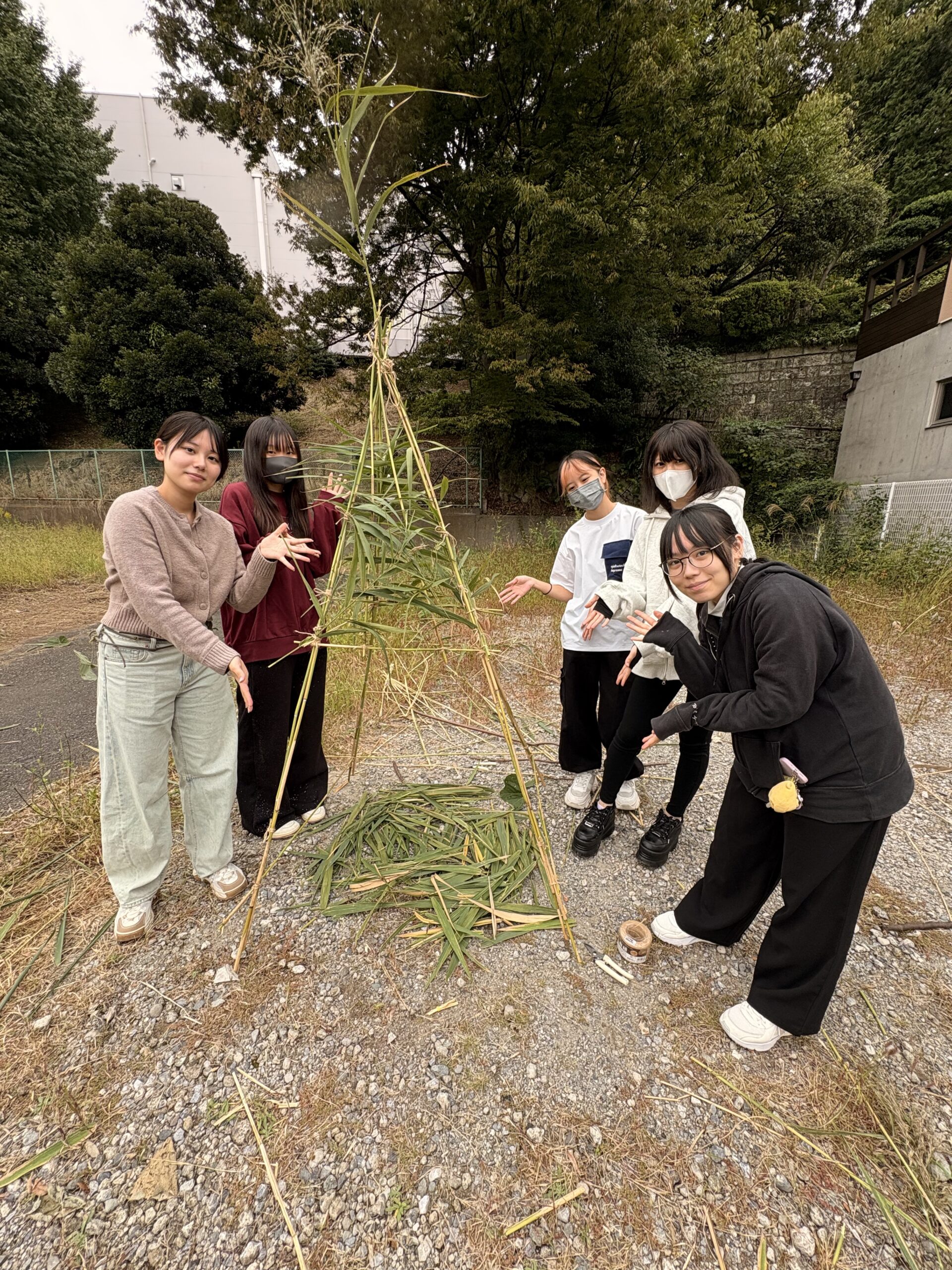 先日は、保育科の造形の授業で、たくさん生えている葦を使った秘密基地作りに挑戦。